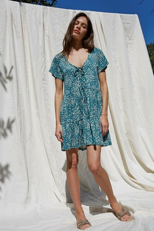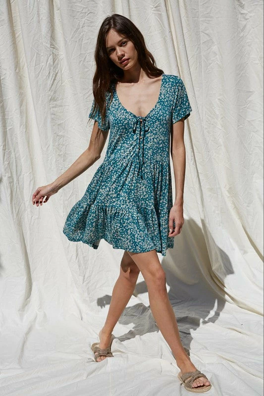 Knit Viscose Jersey Sort Sleeve Ruffled Button Down Strap Loose Fit DressÂ