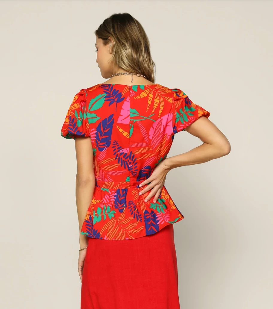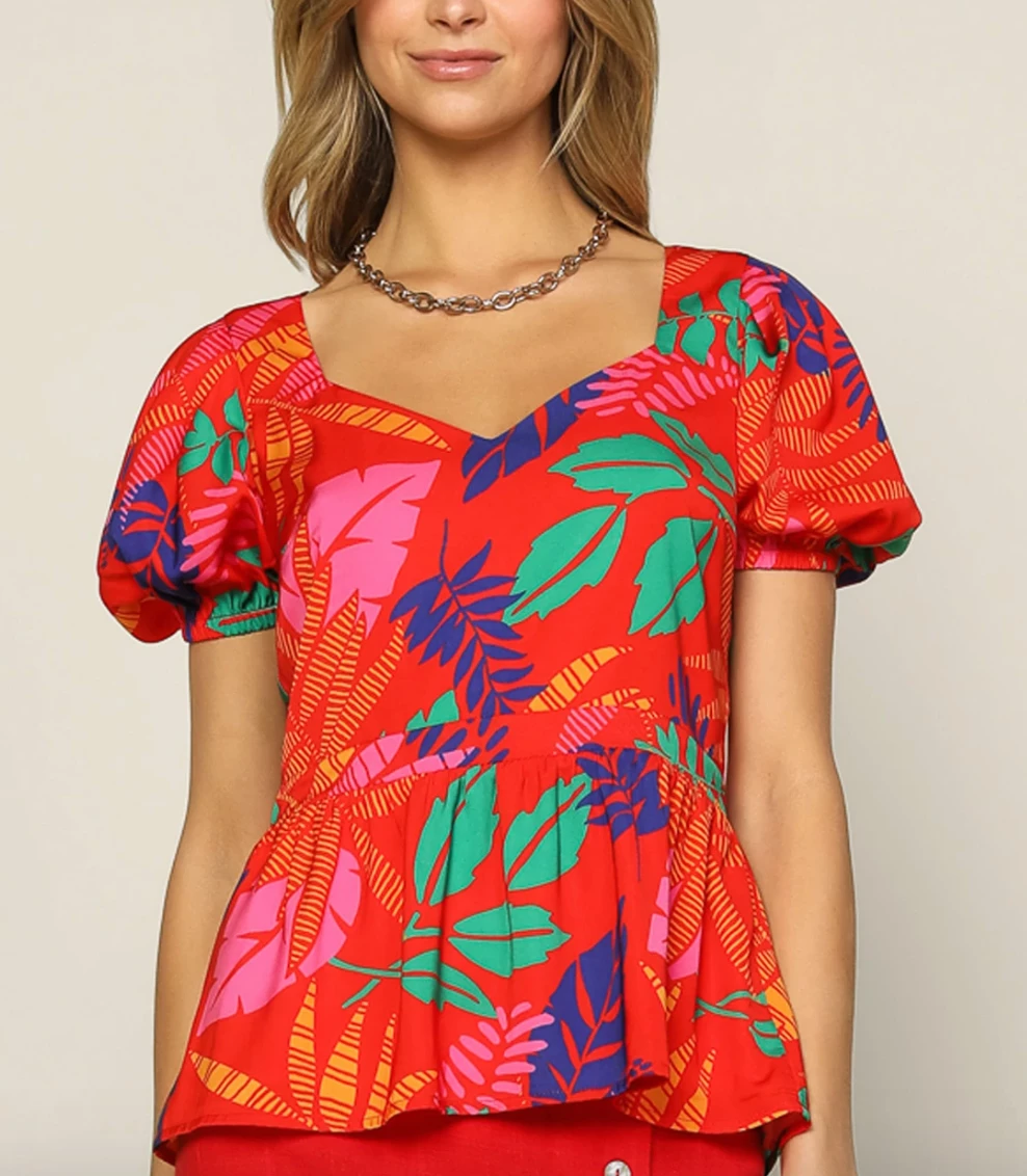 Take on the bright color trend in the playful print of this sweetheart peplum top. With its bold hues and charming motif, it’s a style that’s sure to get tons of compliments.