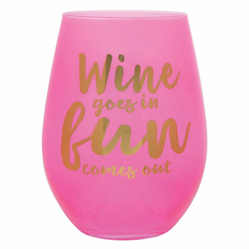 - Pink glass with “Wine Goes In, Fun Comes Out” in gold lettering