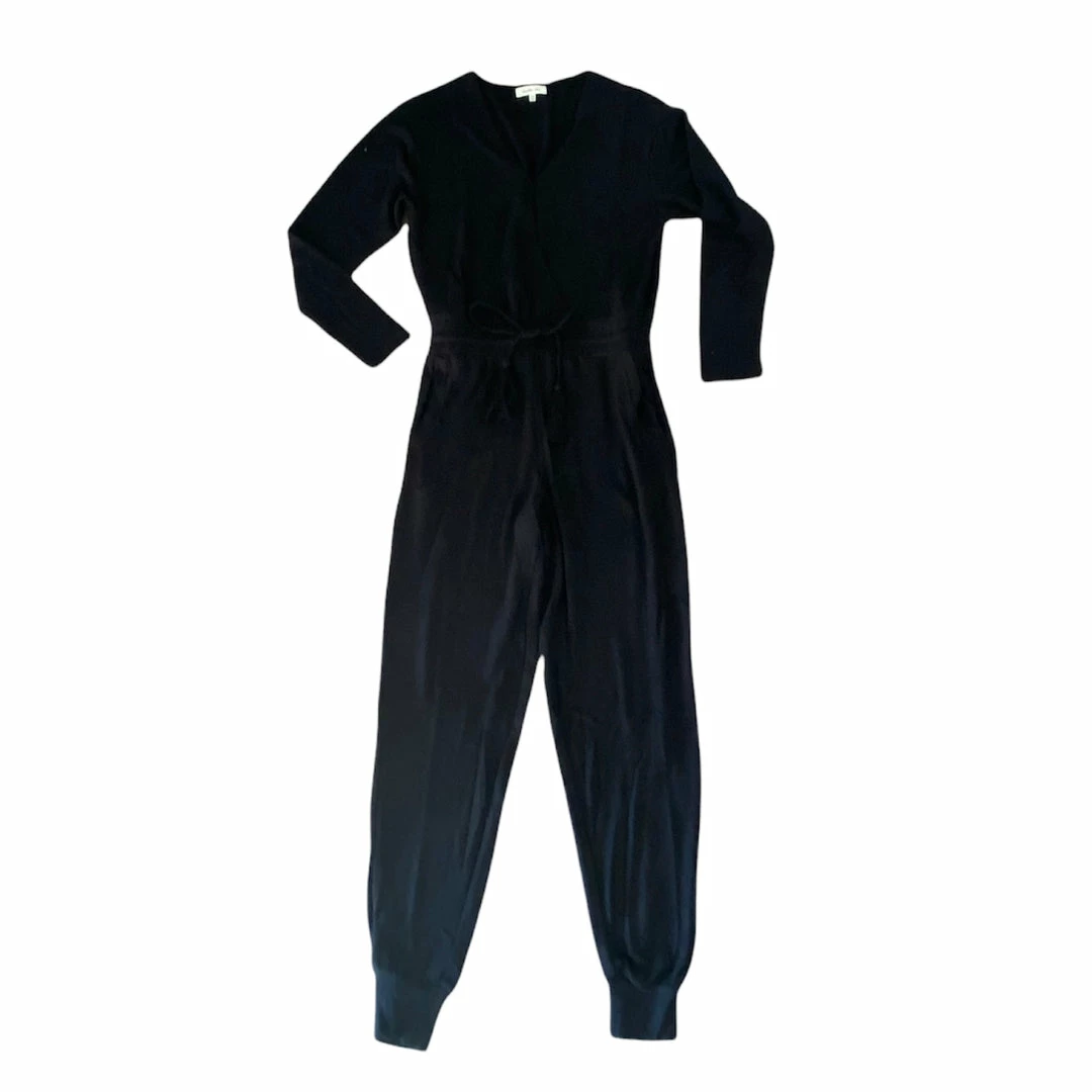 27″ inseam long sleeve overlapped front jumpsuit with waist tie.